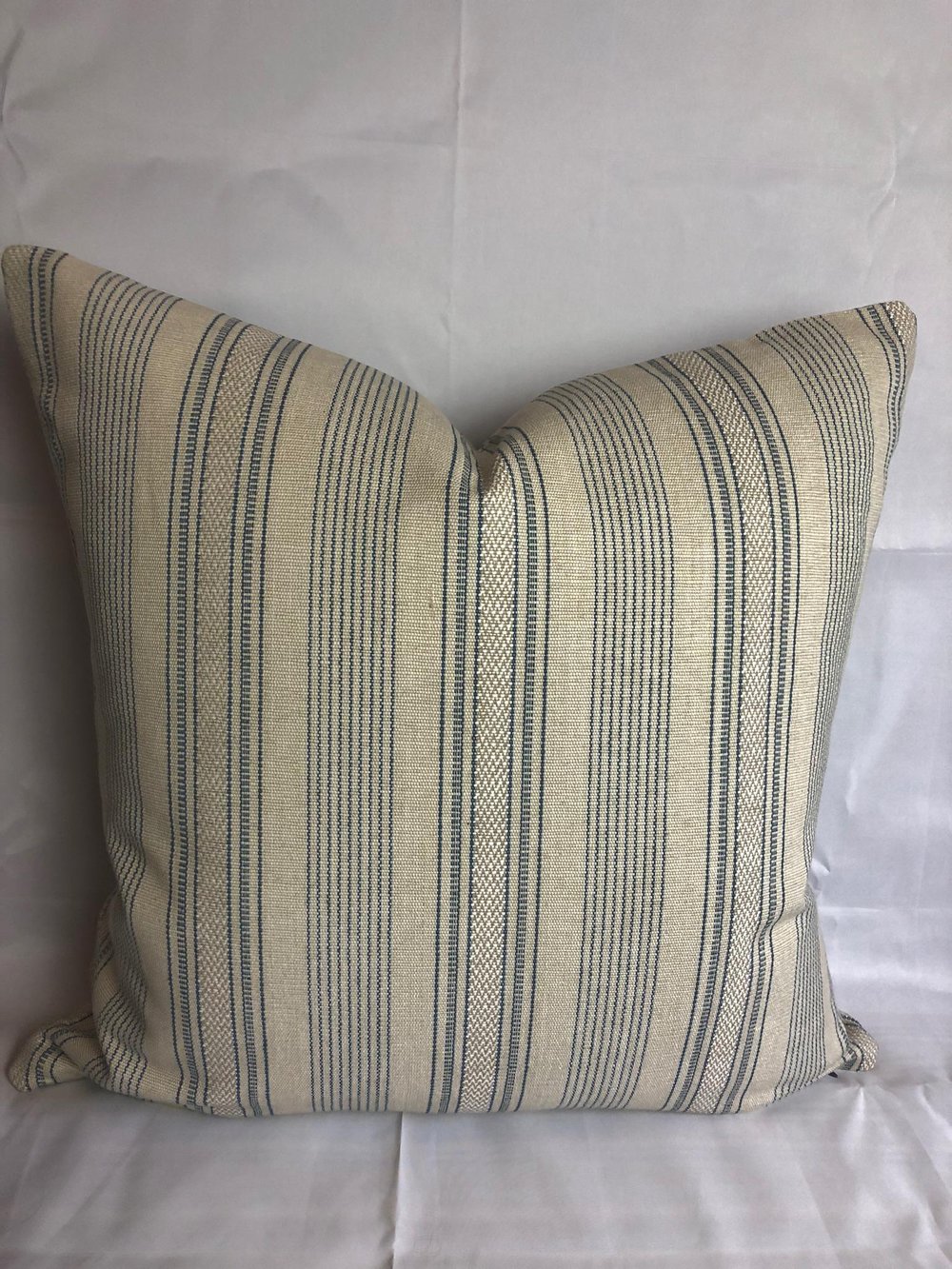 Beautiful woven stripe in linen and cotton from Cowtan & Tout. This is a woven stripe in delft blue and cream. Great for country chic or cool clean modern rooms. Price includes a 90/10 down insert.