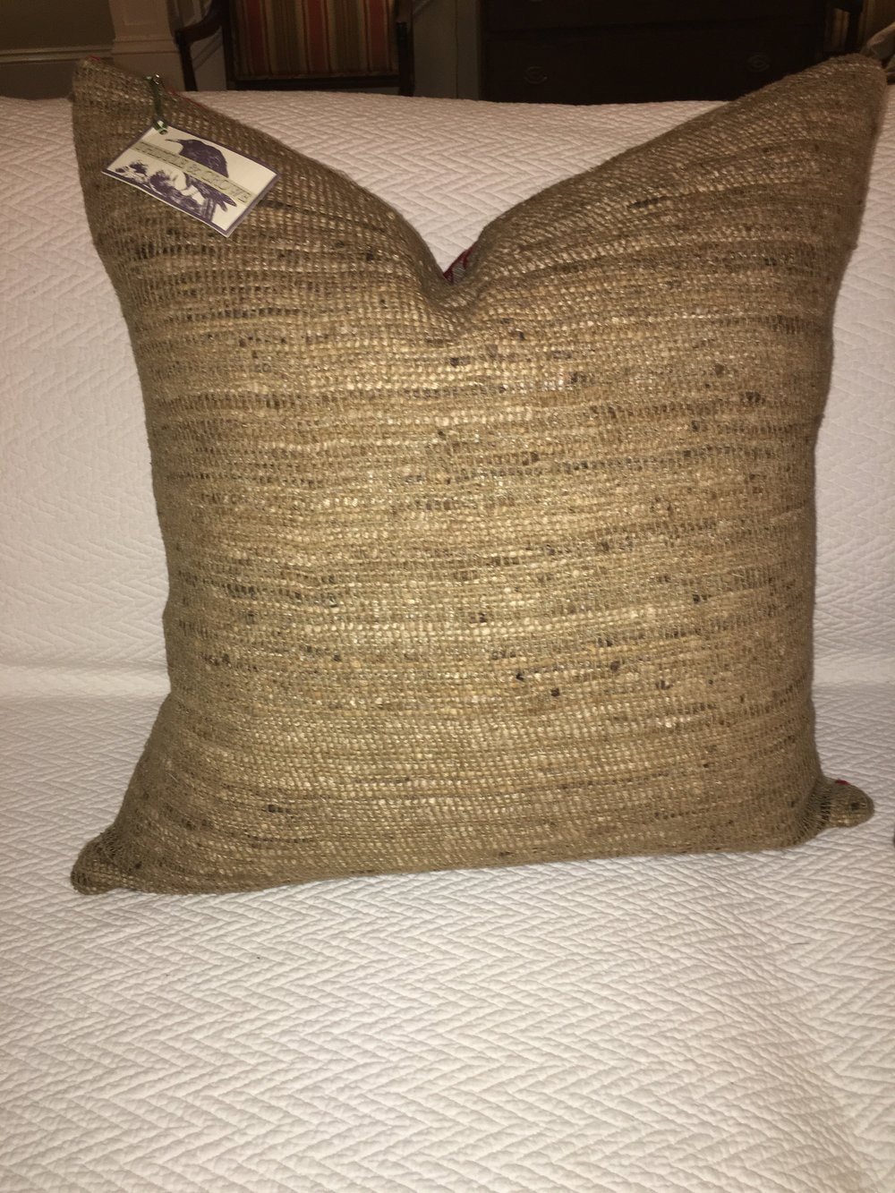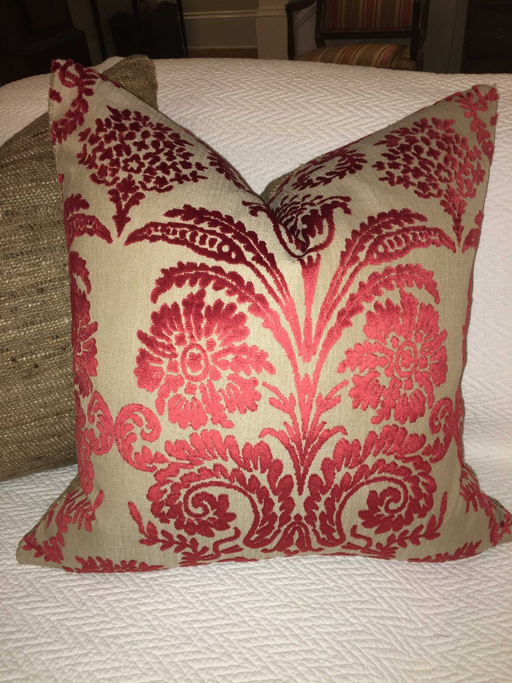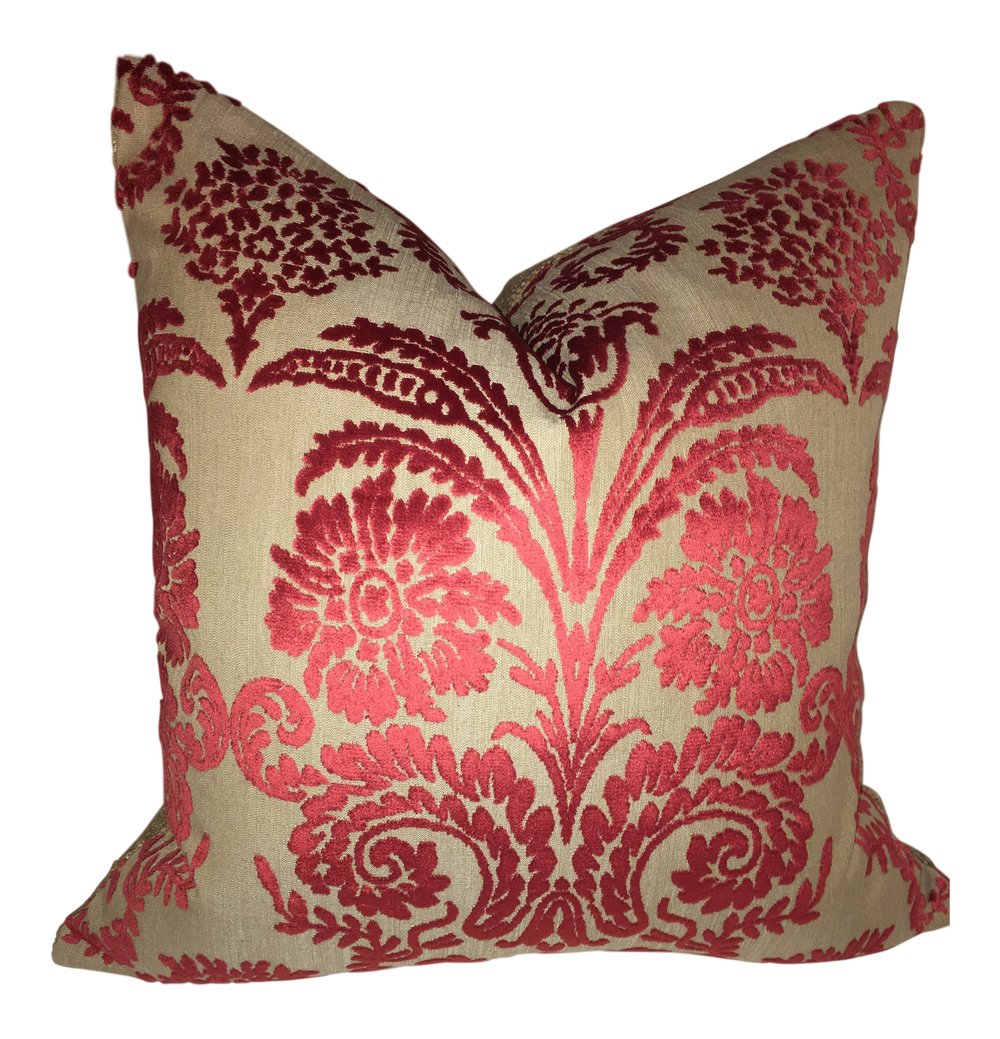 Elegant Designers Guild linen red cut damask pillow. Reverse is Old World Weavers silk. Hidden zipper. Sold individually.