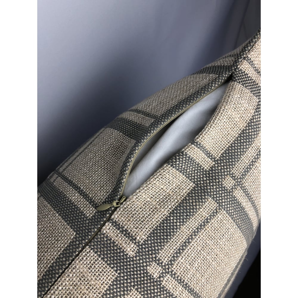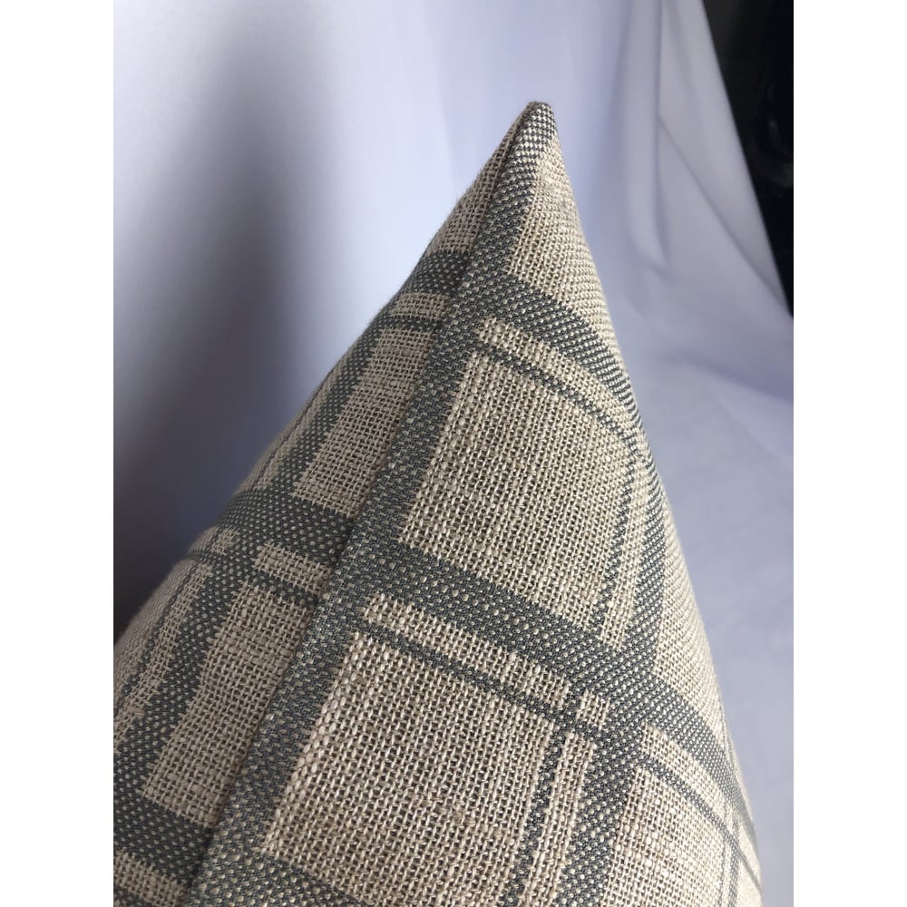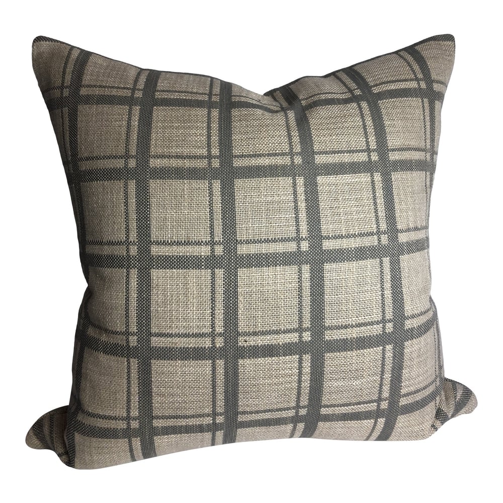 This contemporary plaid in linen and natural fiber from Donghia. This fabric has a beautiful hand and weight. It is done in natural linen and stoney gray color way. They are being sold without inserts. We are offering this option to keep shipping and production costs down.