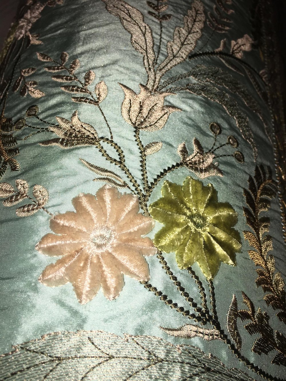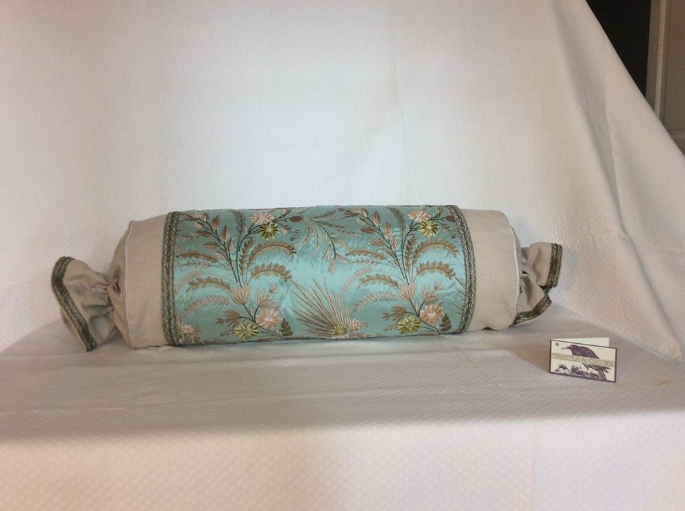 This is bolster with Vervain embroidered silk, with silk lining, mother of pearl button, and french ribbon with metal wire. Cover is removable. Bolster is 27 inch, but cover measurement is 35 inch.
