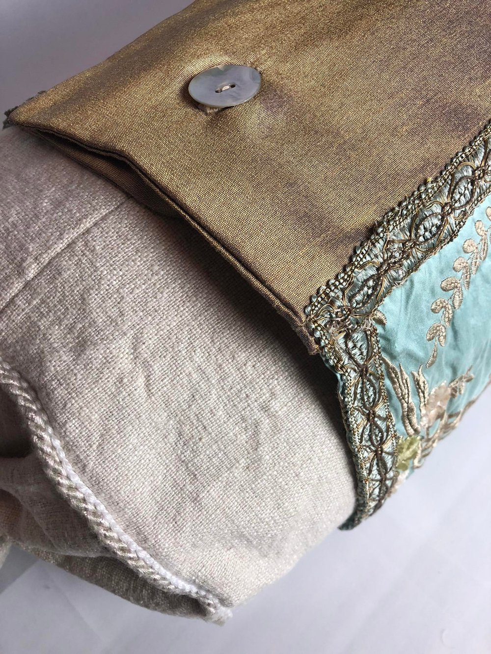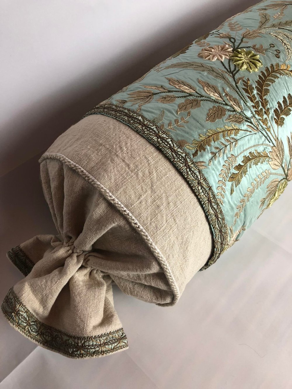 Bolster of washed french linen. Vervain embroidered silk button wrap. French ribbon trim and Schumacher cording. All designer natural fabrics.