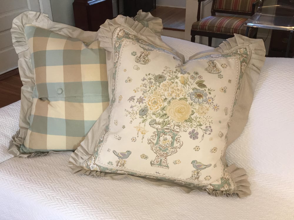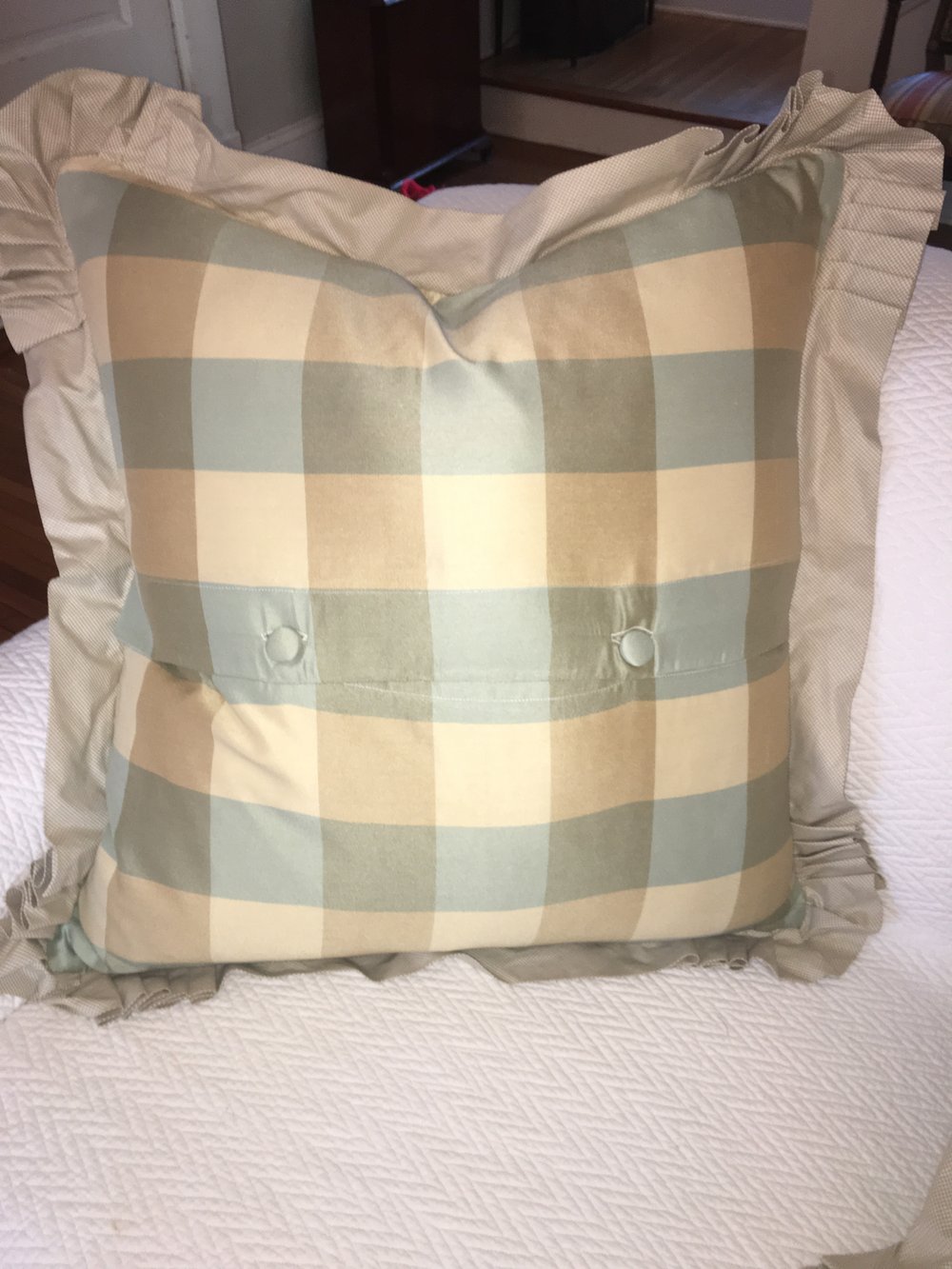 Cotton print floral fabric by GP & J Baker. Framed in a ruffled coordinating miniature check with added ording. Reverse is blue buffalo plaid with decorative button closure.