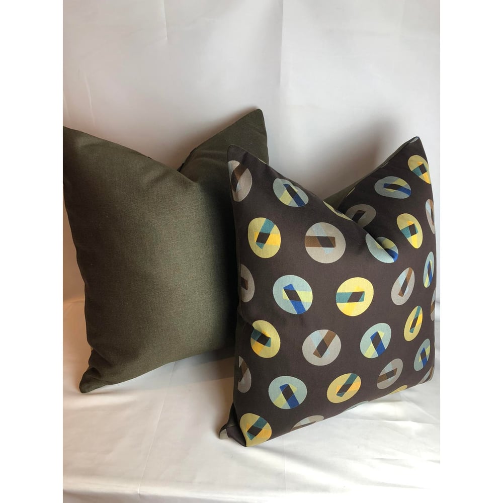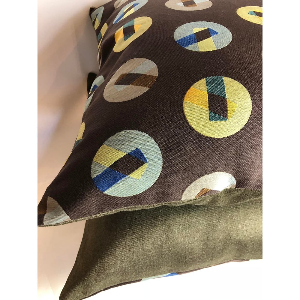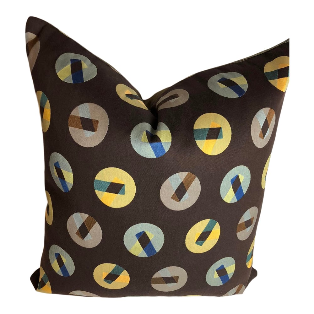 I love the playfulness and color of this Maharam fabric. Rich chocolate grounds colorful print. It is elegant and rich. A wonderful modern design. A 90/10 insert included backing fabric is retro feeling brown men suiting fabric. Also not shown 2 coordinating 14.5 by 25 by 6.5 contact us