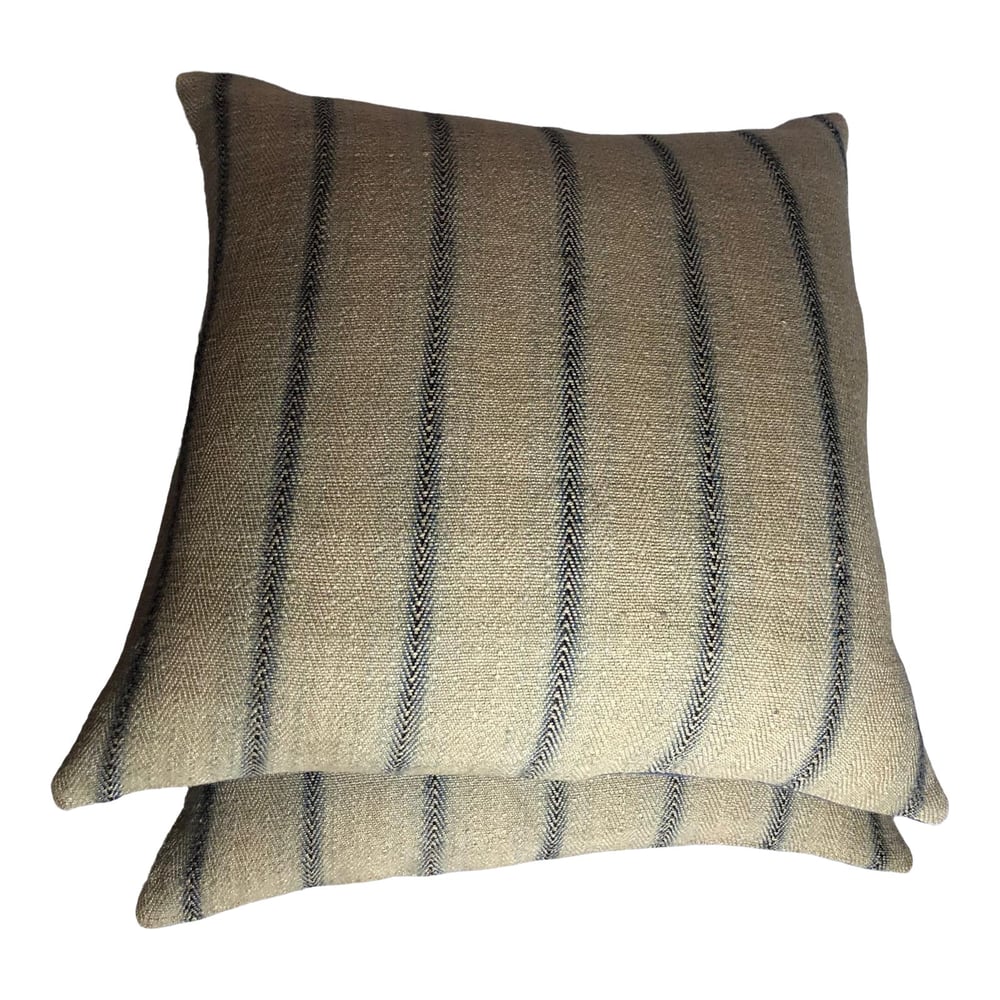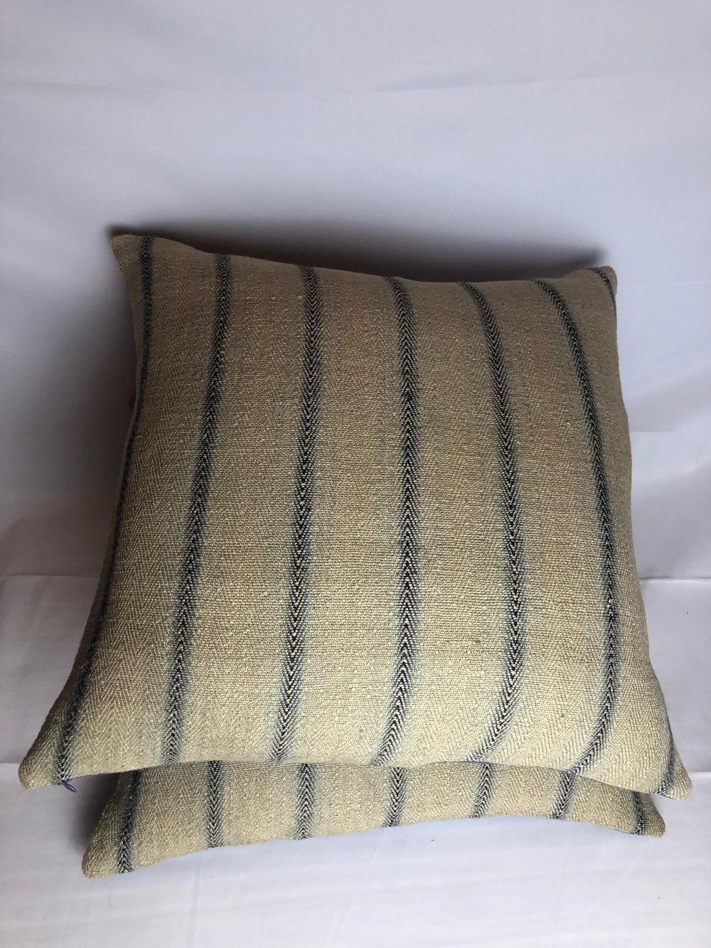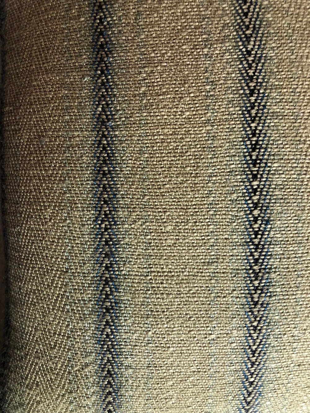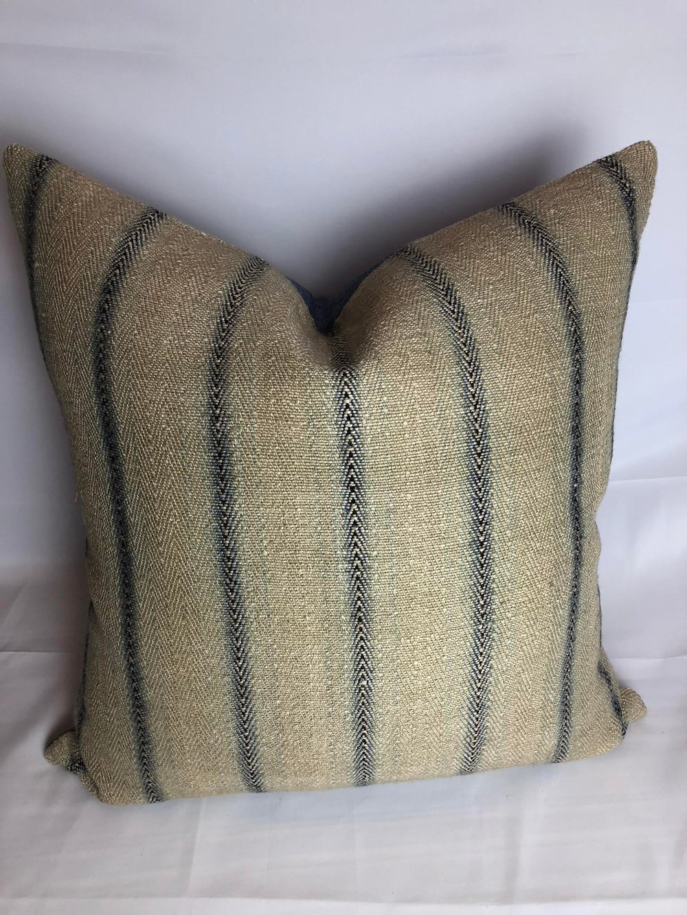 A favorite of mine. This blend of natural fibers, has texture with woven stripe of indigo and ink blue. It all woven in a chevron weave pattern. I have used a cotton and line Wolf Gordon Maxton's blue indigo fabric. Includes 90/10 insert. I also have two 17.5 by 26.5 pillows.