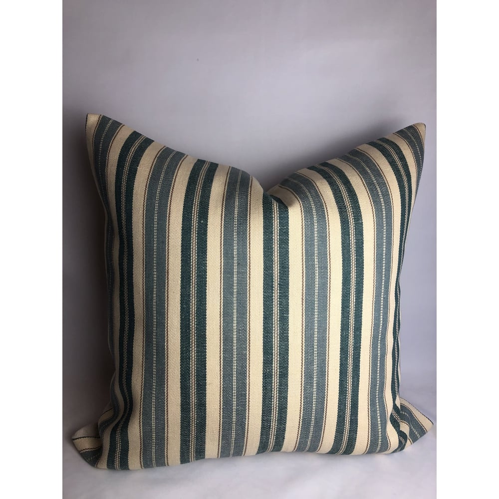 This ticking stripe is in slate blue,french blue and cream with small stripe accent in dark taupe. This beautiful Ralph Lauren linen and twill fabric is backed in washed vintage french linen. I am offering these pillows without insert. If inserts are desired contact us, we can offer them in 90/10, 50/50 and 100 down blend. Also note there is a hidden zipper.